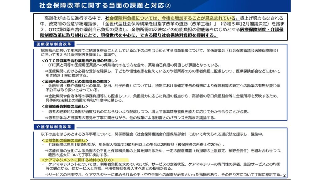 ⚫︎2025年12月(現在の結論): 結局、今回も「医療と介護の両方の負担を同時に上げるのは、お年寄りの生活へのダメージが大きすぎる」という判断になり、本格的な実施は「2027年度の次期改正」まで、再び先送りされる流れとなりました。