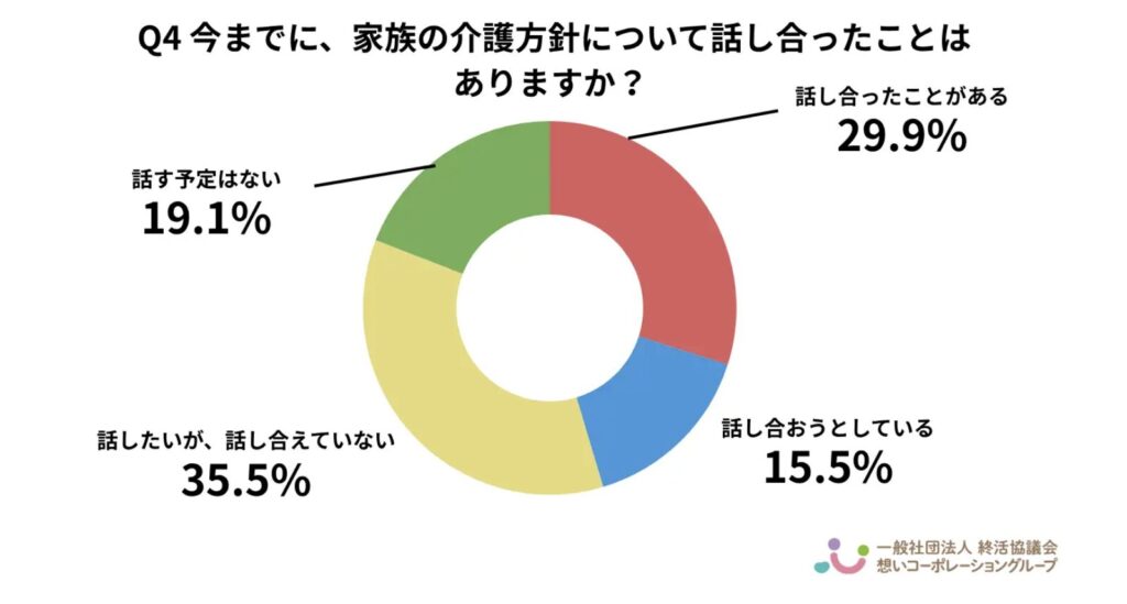 実際にアンケート調査を見てみると、家族の介護方針について「話し合ったことがある」と答えた人は29.9%にとどまっています。一方で、最も多かった回答は「話したいが、話し合えていない」の35.5%でした。
