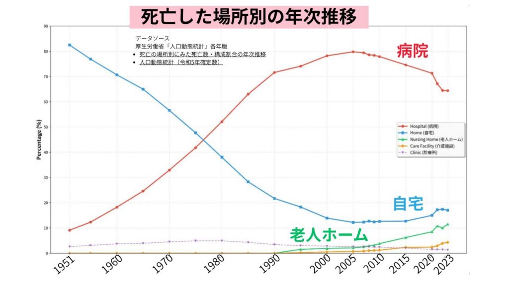最近の傾向として、病院で亡くなる人より、施設や自宅で亡くなる人が増えています。