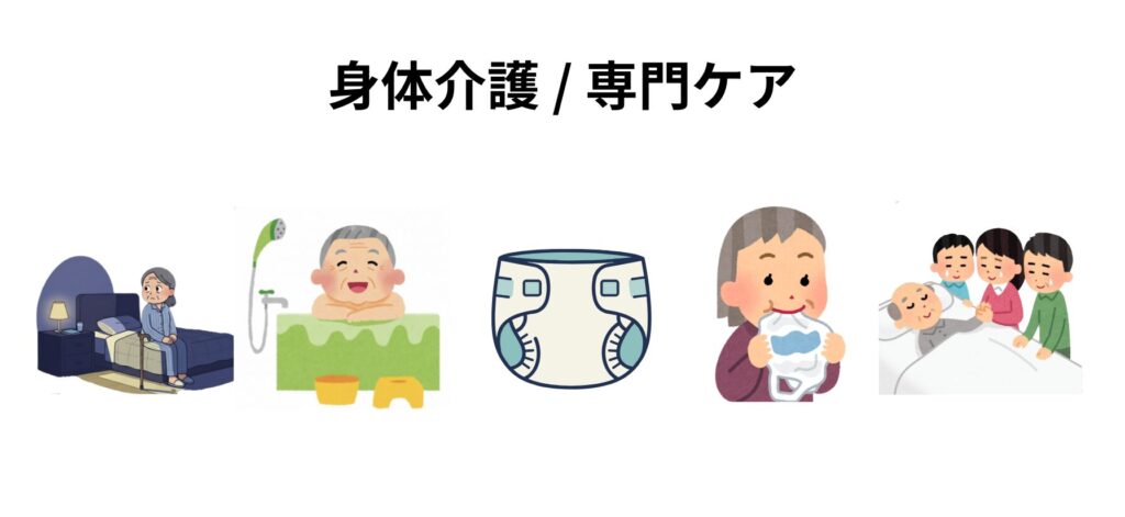 もちろん、お家でのお風呂の介助や、オムツ交換も可能で、要介護者の体に直接触れる介助として分類しました。