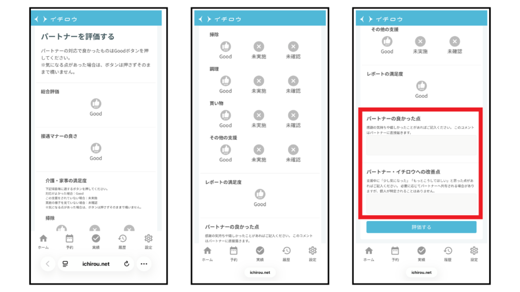 ヘルパーさんの評価は、「good」「未実施」「未確認」の3種類。さらに、最後に「良かった点」と「改善点」を記入する自由記述欄があります。選択肢に「bad」はなく、気になる点があれば記述でしっかり伝える仕組みです。